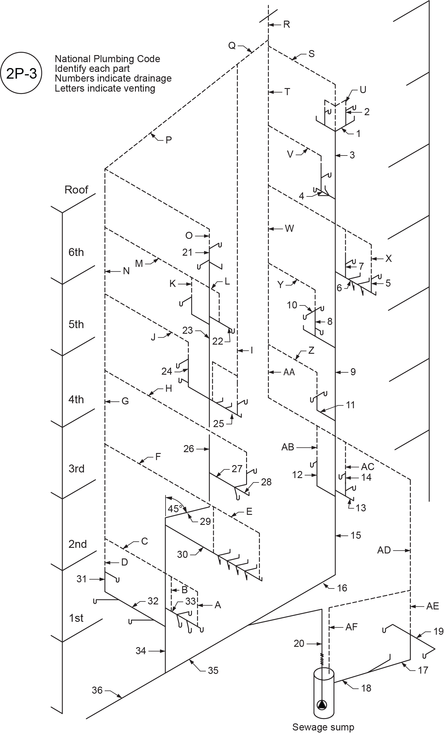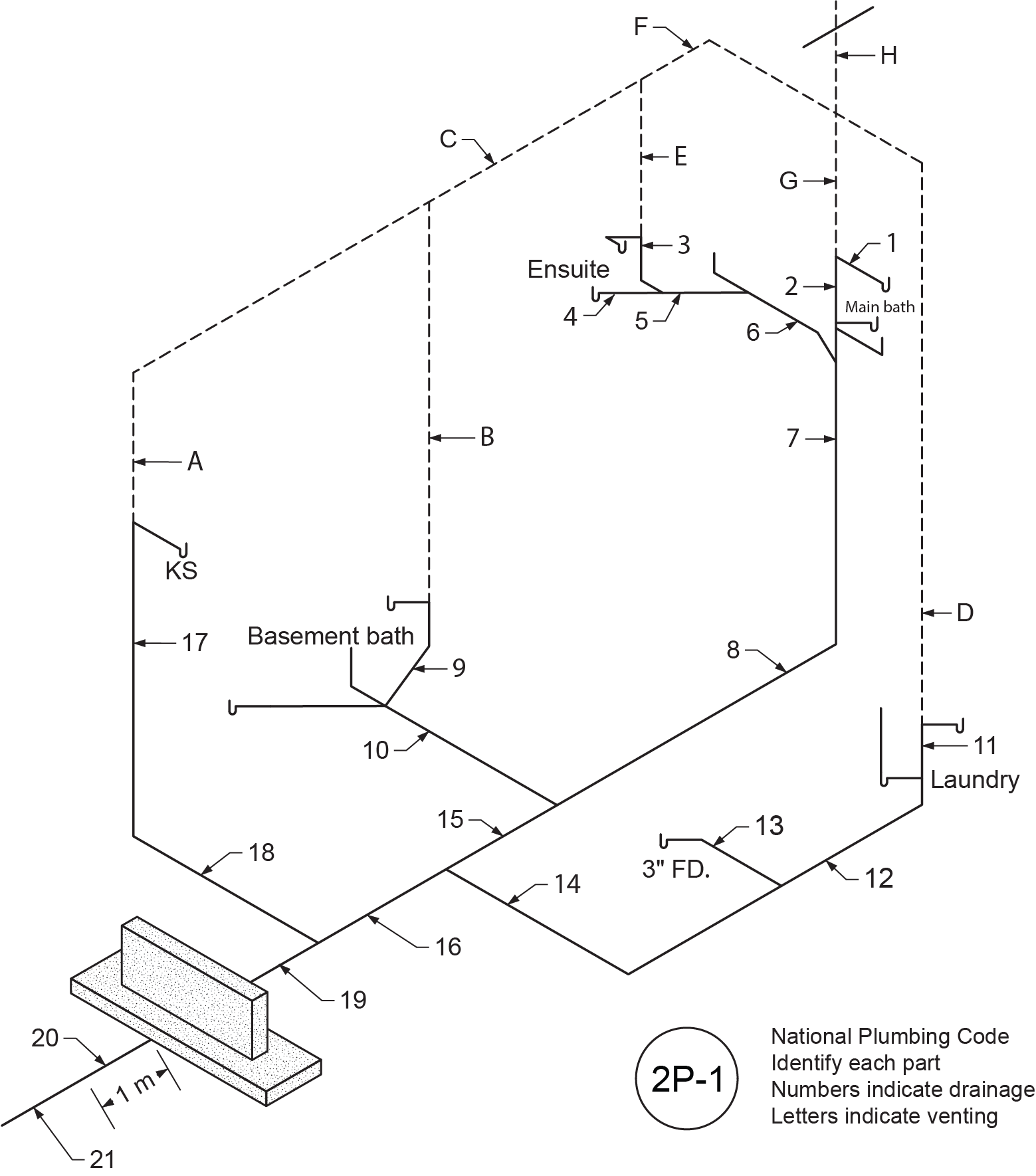 1. Using Figure 2P-1, fill in Table 1 by identifying the drains indicated by the numbers and the vents indicated by the letters.